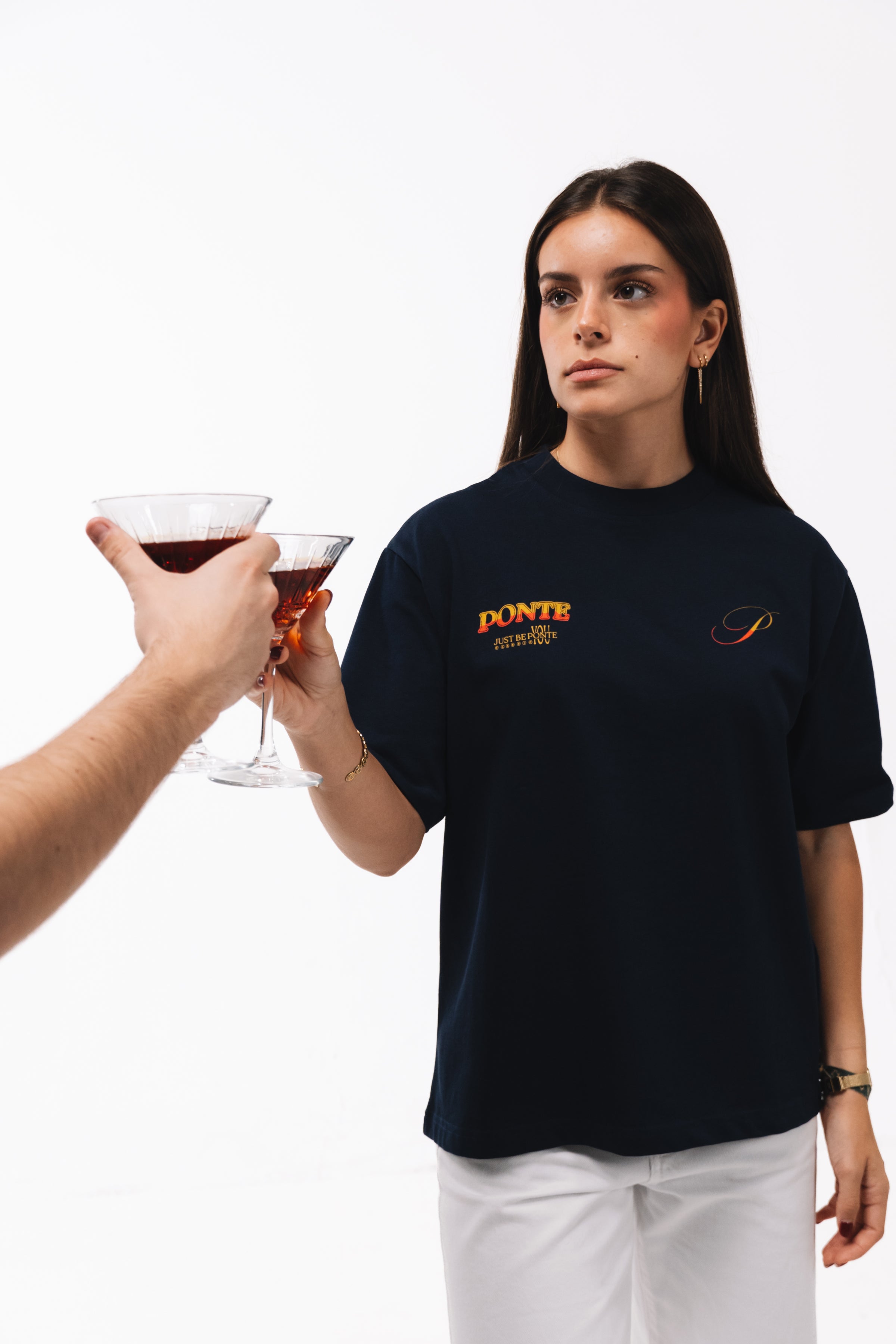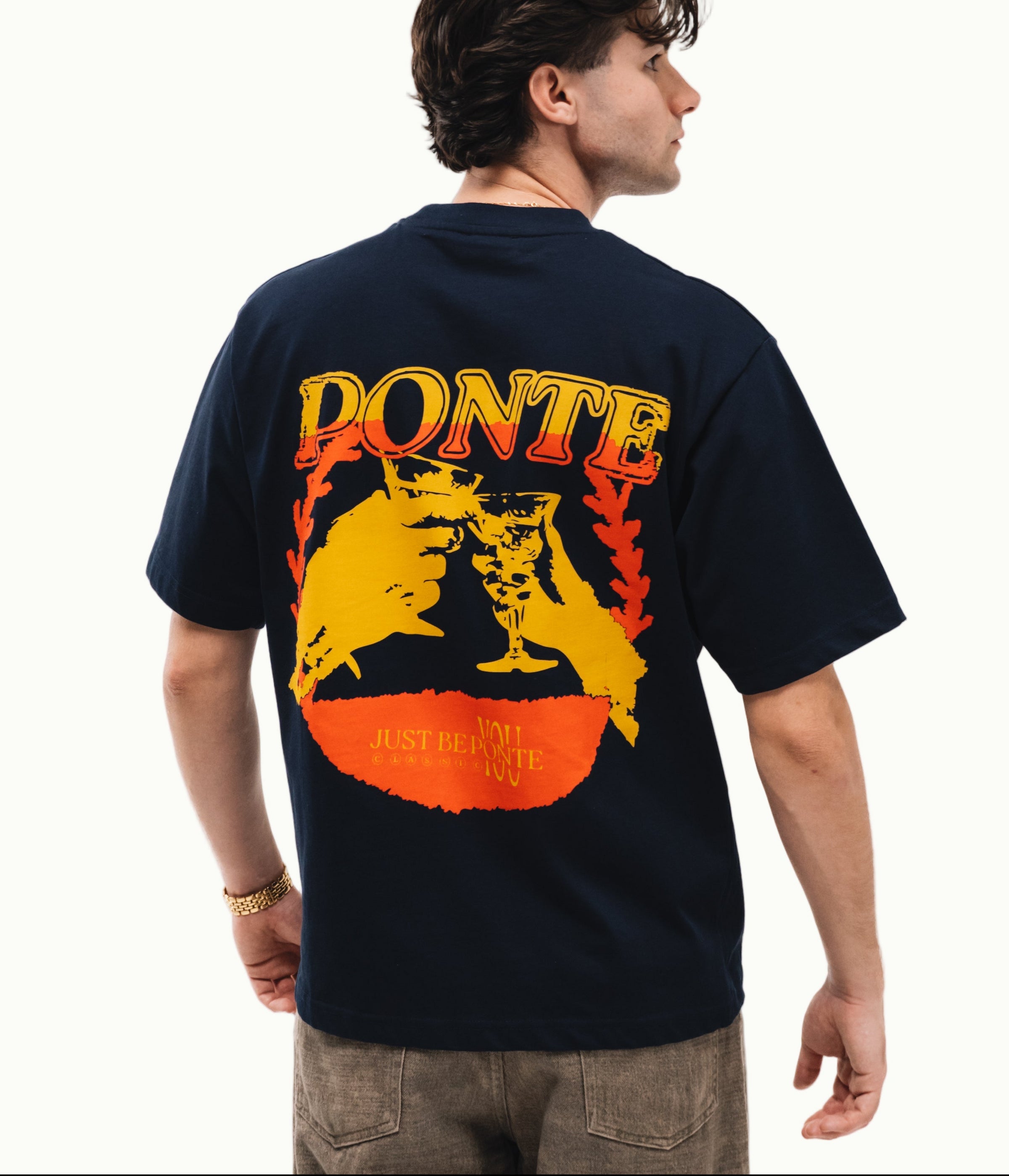 Las siluetas que brindan en la espalda cuentan una historia propia. Dos copas alzadas como símbolo de unión, fraternidad y energía que capturan el espíritu de la celebración.